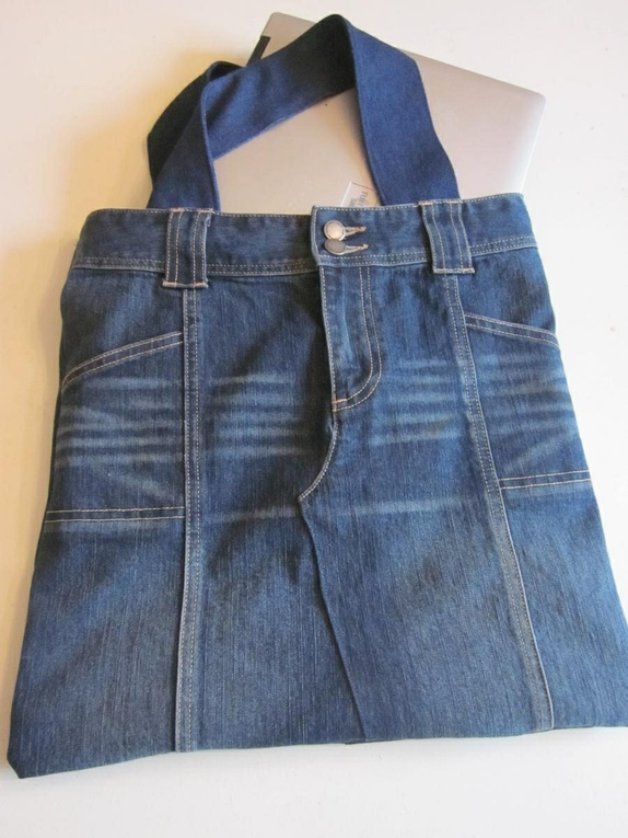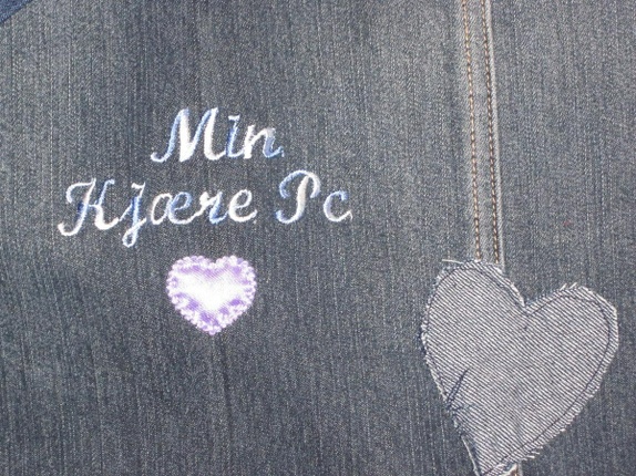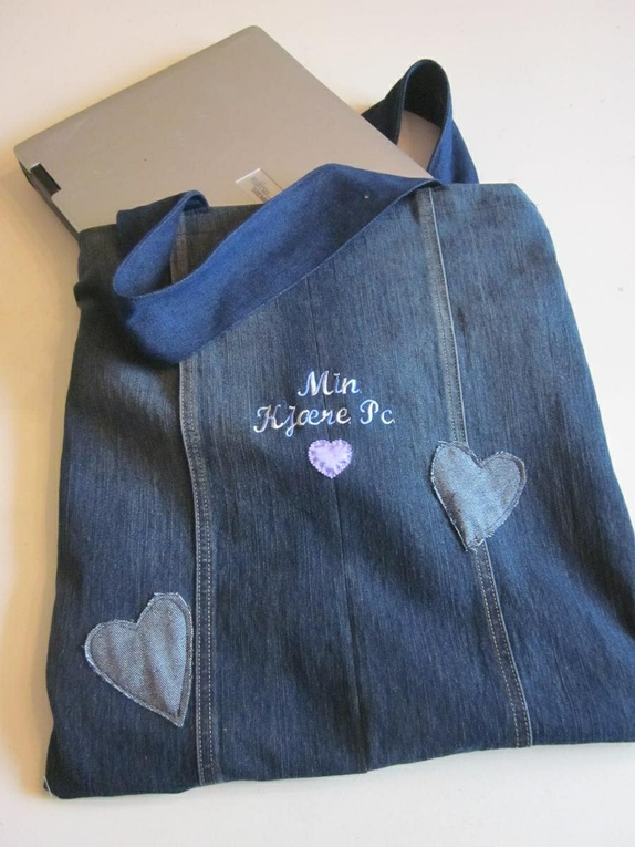 Røff pc veske lagd av olabukser :)Med lommer på ene siden og broderi og applikasjon på andre.Vesken er foret !