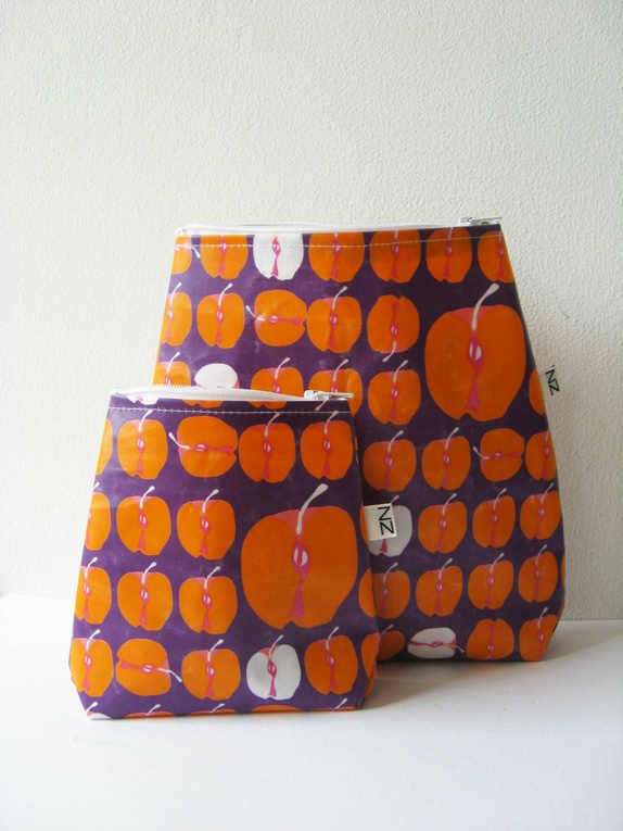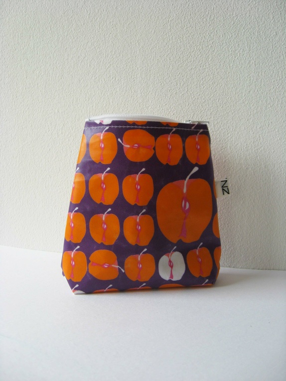 Liten pung med 10 cm glidelåsåpning. Pungen er sydd i et lilla vannavstøtende materiale med små og store, oransje epler. Og så et lite hvitt eple her og der.