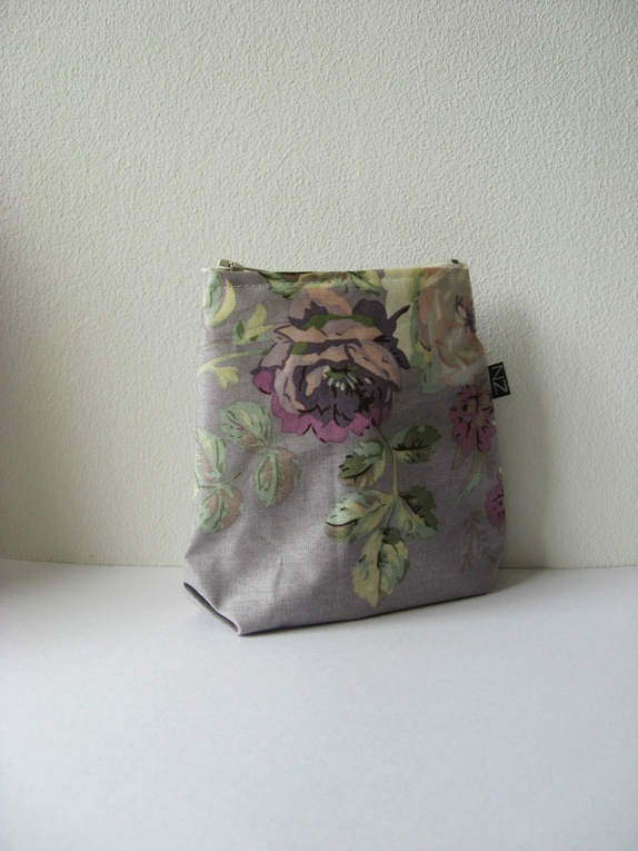 Liten pung med 10 cm glidelåsåpning. Pungen er sydd i et romantisk materiale i dus lavendellilla med roser i lilla og blå toner med et innslag av grønt.