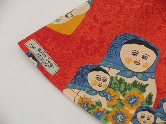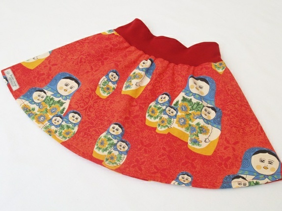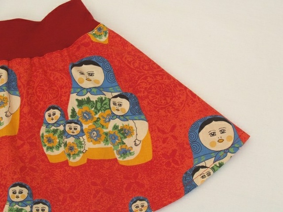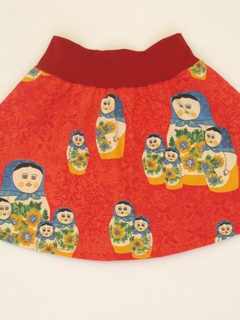 Fargerikt og behagelig skjørt med god vidde og myk elastikk i livet. Sydd av gjenbrukstekstiler. Selve skjørtet er i ren bomull, med matryosjka-figurer i ulike størrelser på rød bunn med svakt blomstermønster. Mørk rød elastisk jersey i livet.