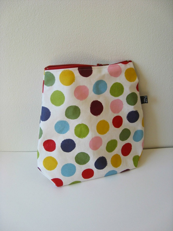 Mellomstor pung med 15 cm glidelåsåpning. Pungen er sydd i et hvitt plastbelagt bomullsmateriale med store prikker i spreke farger og en rød glidelås.