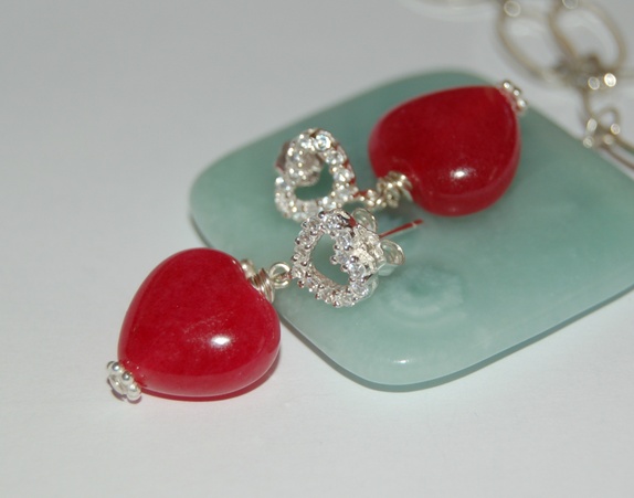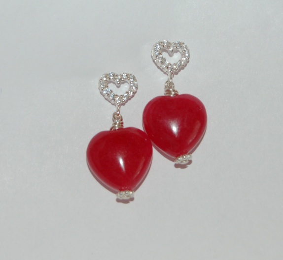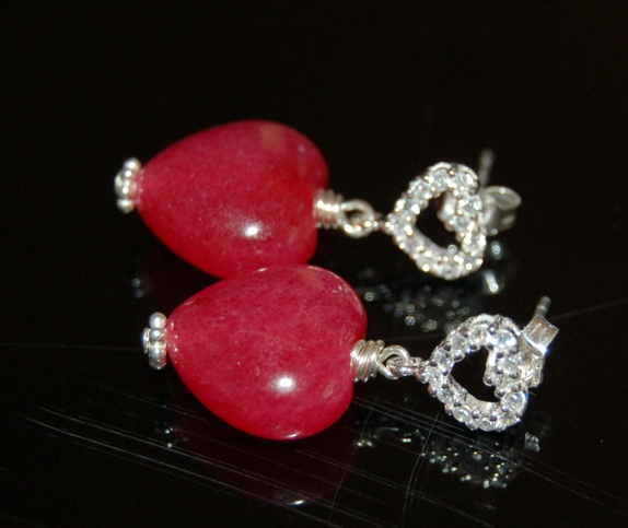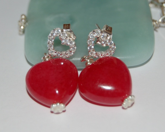 Nydelig kirsebærfarget jadehjerter hengende på sterling sølv hjerte med tjekkiske krystaller. Alt metall er sterling sølv 925.