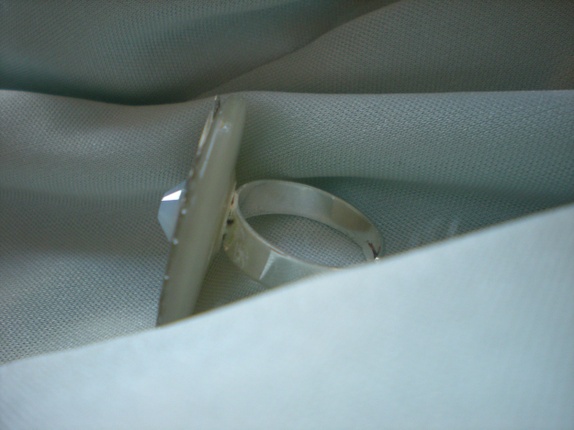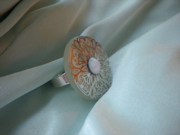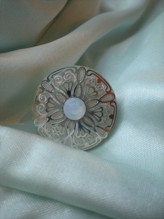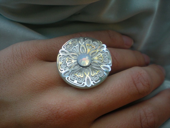 Vakker, rund ring med sølvfarget mønstrete dekor og glitrende swarovski-sten.