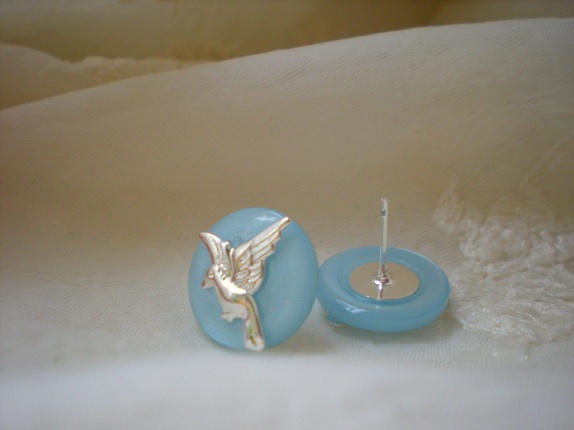 Nydelige øredobber i himmelblå farge med sølvfargede duer som dekor.