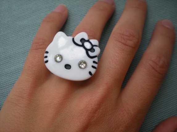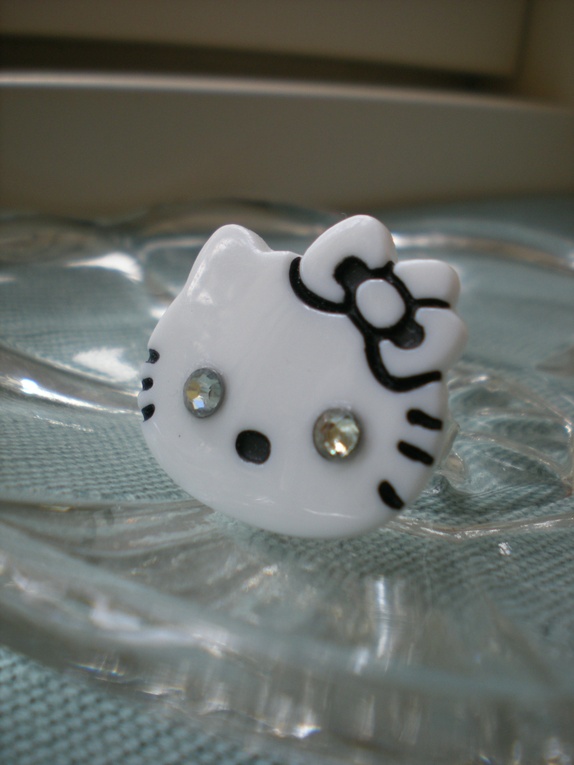 Ring med hvitt kattehode. Kattens øyne er av glitrende, grå swarovski-stener.