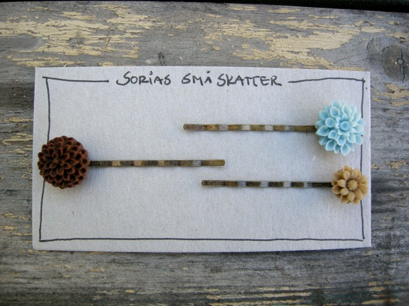 3 nydelige hårspenner i lys blå,beige og brun.Hårnål i oksydert kobber med akrylblomster.Limet er profesjonelt smykke lim og etterpå lagt i herder. Hver spenne måler ca 5,5 cm.