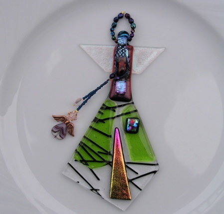 Et blikkfang for ditt vindu.Englene er laget i kunstglass og dichroic glass, og er ca13 cm høy.