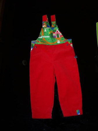 Selebukse sydd av rød babycord og vevd bomull med landskapsmotiv. 100 % bomull.