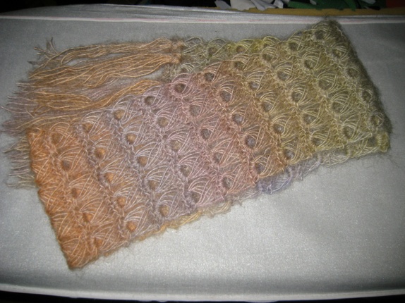 Strikka i Mohair Lux. Ein gamal teknikk der ein brukar ein svært tjukk strikkepinne, og ei tjukk heklenål.Vaskeråd: Handvask med ullvaskemiddel.Søkeord: skjerf, sjal, ullFørpris: 180kr