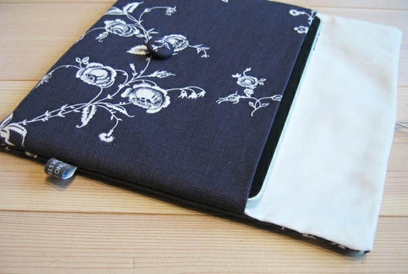 Etuiet består av én stor lomme, akkurat passe til en iPad. Lukkes som en konvolutt, og festes enkelt med strikkhempe over stofftrekt knapp .