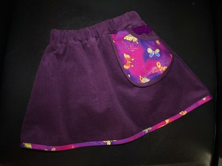 Skjørt sydd av mørk lilla babycord og vevd bomull med sommerfuglmotiv. 100 % bomull.