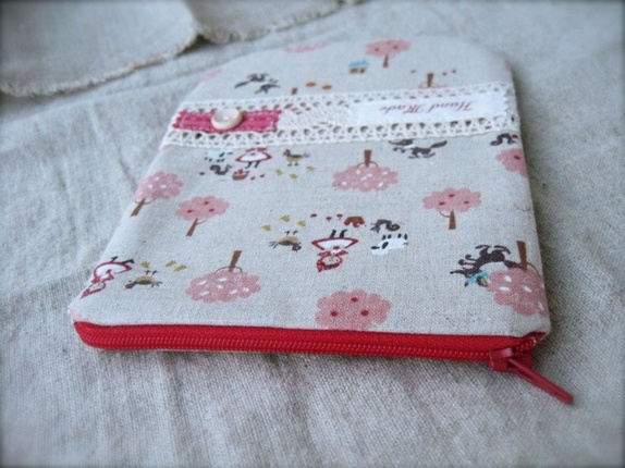 - En liten pung laget i bomull. Foret med kremfarget bomull - med skrift og små blomster.