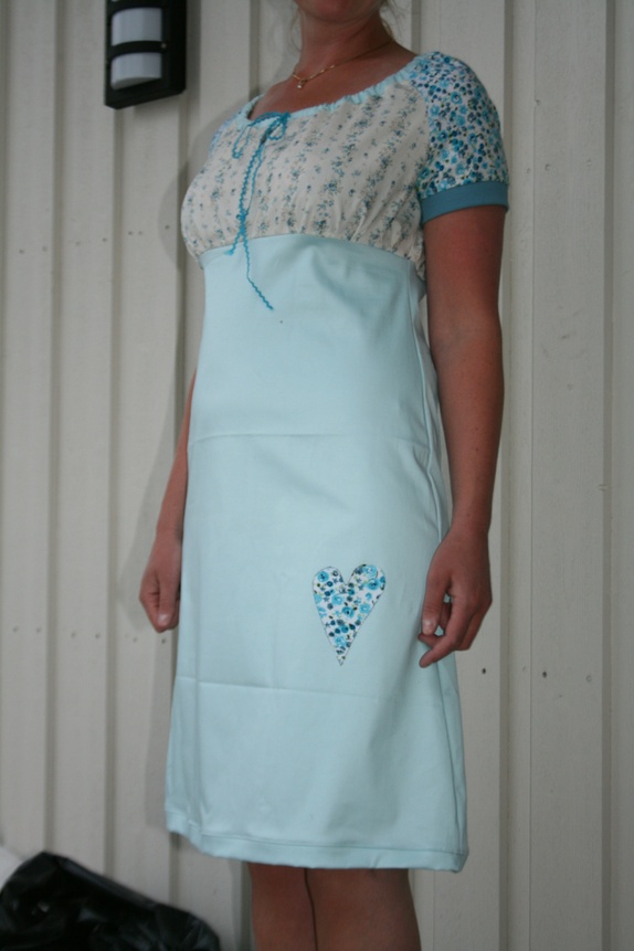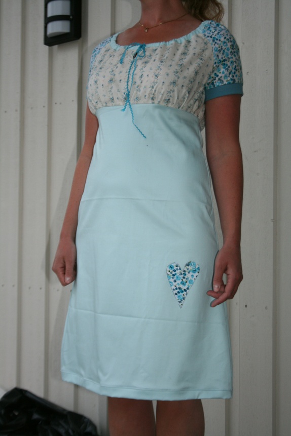 Lys og lett kjole i bomull med rynket bærestykke som gir et feminint preg og plass til bysten. Snøring i halsen slik at man selv bestemmer utringningen. Turkise detaljer. Aplikert hjerte foran.