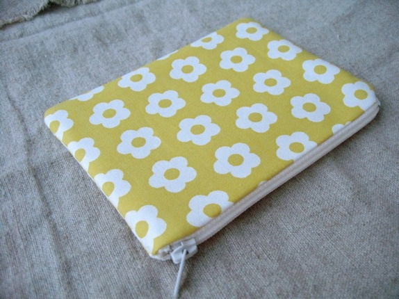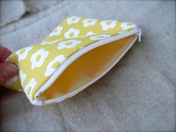 Liten pung laget i bomull. Ytterstoff i klar gult med retroblomster. Foret med lys gul bomull.