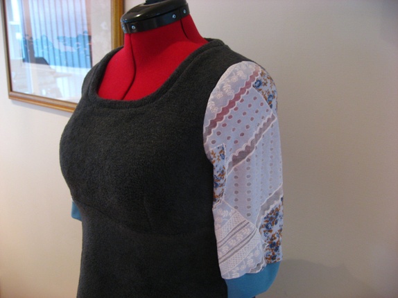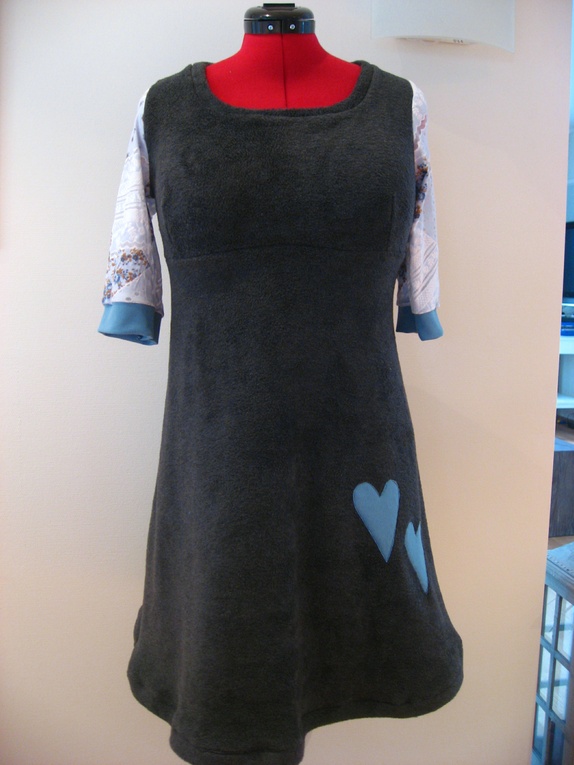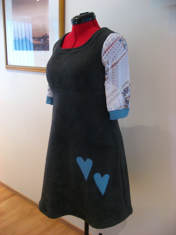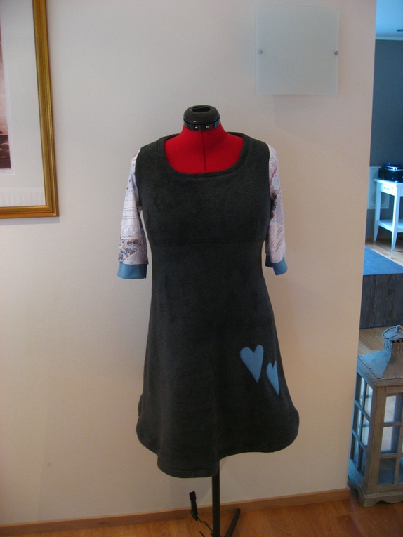 God og myk koksgrå fleecekjole med lette armer i blåtoner. Innsnitt på brystet og innsvingt i livet for feminin fasong. God vidde over hofter og i skjørtet.