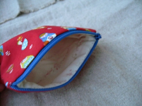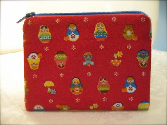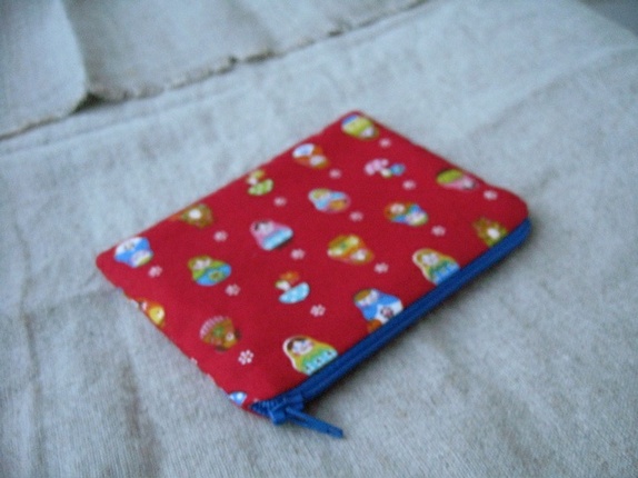 Liten pung laget i japansk bomull. Små russiske dukker på klar rød bunn. Foret med et hyggelig stoff i bomull med små blomster.