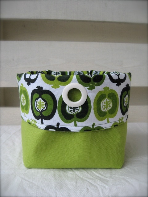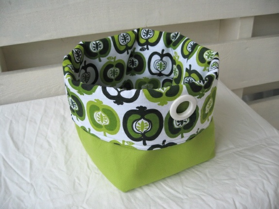 Romslig stoffkurv i bomull - grønne epler på hvit bunn.