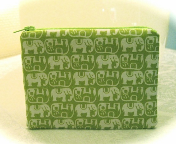 Liten pung laget i bomull. Grønn med elefanter. Foret med lys grønn bomull.