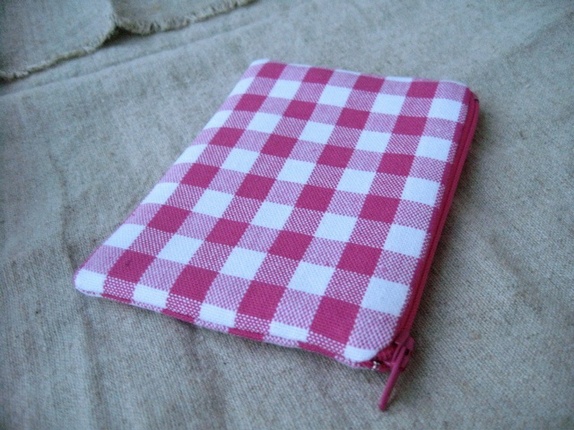 Liten pung laget i bomull. Ruter i skarp rosa og hvit. Foret med bomull med bittesmå ruter i to rosa nyanser.