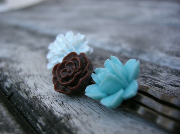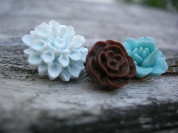 3 nydelige hårspenner i blå toner og sjokolade brun.Hårnål i oksydert kobber med akrylblomster.Limet er profesjonelt smykke lim og etterpå lagt i herder. Hver spenne måler ca 5,5 cm.