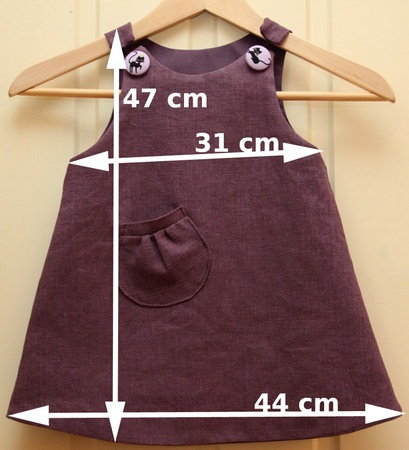 En søt liten Majakjole i bare lillafarger. Kjolen er i lilla lin med en søt liten lomme i samme stoff. Fóret med lilla bomullsstoff. Store tøffe lille håndlagde knapper fra "SewingRabbit" med svarte katter. Festes med strikkhempe over skulderen.