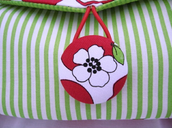 Lukkes med en stor knapp trukket med stoff.