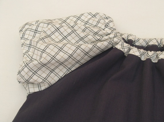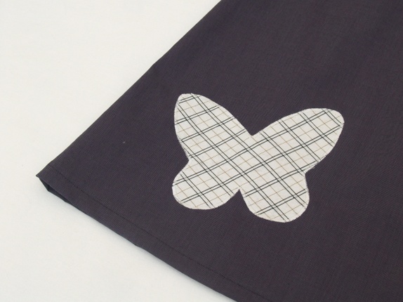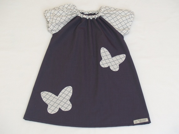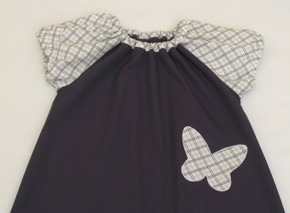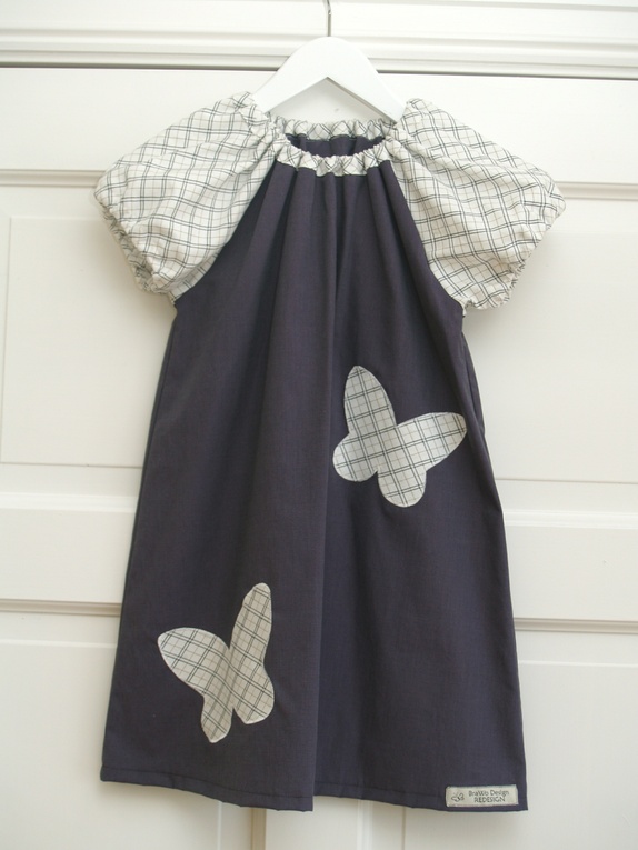 Rynkekjole med puffermer, sydd av to gjenbrukte herreskjorter av topp kvalitet. Forsiden og baksiden er i ensfarget mørk lilla. Armene og halsen har sorte og brune striper som danner ruter på hvit bunn. Kjolen er pyntet med to applikerte sommerfugler som er i samme stoff som armene. Strikk i hals og armer.