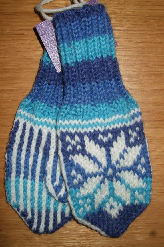 Gode, varme og fargeglade ullvotter i blånyanser og hvitt :) Ca 2-3 år, vottene måler ca 20 cm fra øverst i vrangbandet til tupp. OBS ganske langt vrangband slik at vottene sitter godt på under dressen/jakken.... Ca 8 cm fra tommel til tupp.... Med selbumønster...