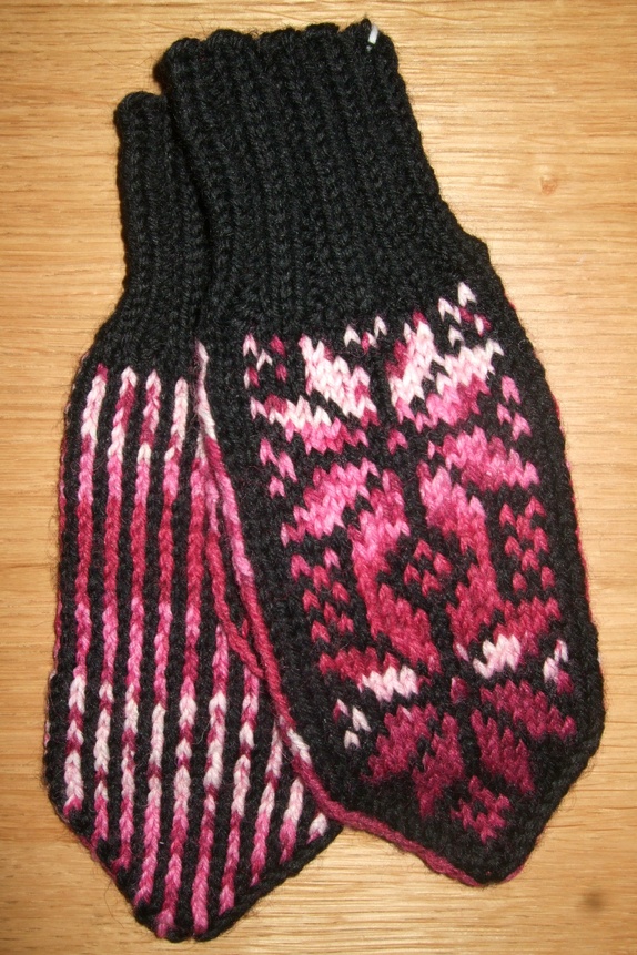 Gode, varme og tøffe ullvotter i svart og rosa nyanser... Ca 7 år og oppover... Måler ca 13 cm fra tommel til tupp... Med selbumønster...