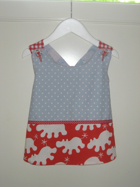 Skjønn forklekjole sydd i babyblå polkadot bomull, rød bomull med flodhester, og rødrutet bomull. Kjolen er pyntet med et rødt bånd med prikker, og er helfòret med bomull i blåtoner.
