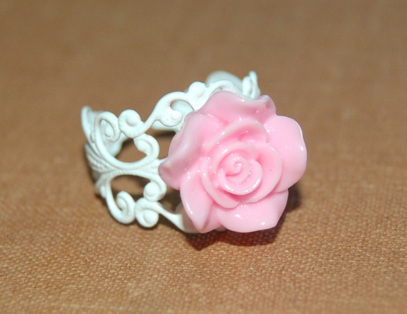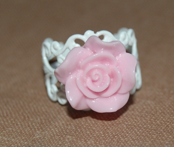 Rosa Rose på hvit ring. Rosen er laget i polymer clay og har en spesiell glans.Ringen er regulerbar og passer på de fleste fingre.