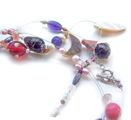 Det er langt nok til to ganger rundt halsen. her er det perlemor og glass i fine farger!