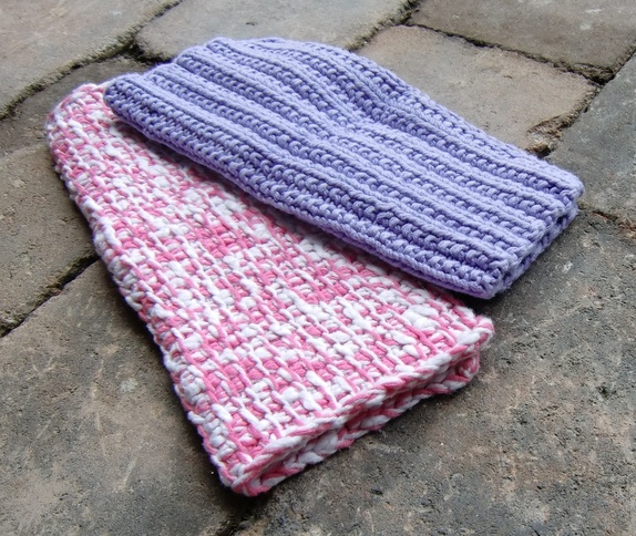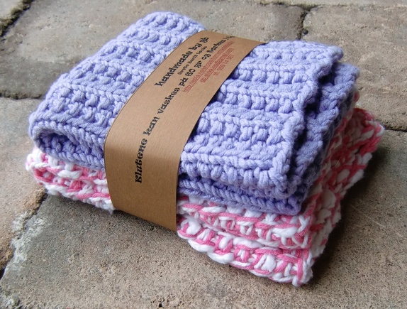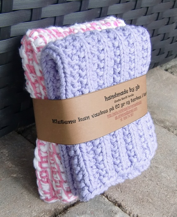 Klutene er strikket og hakket i bomullsgarn.