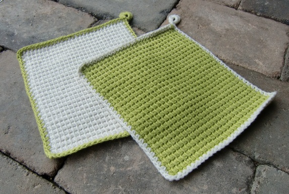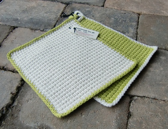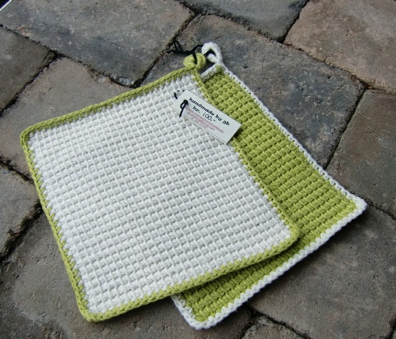 Tykke og gode grytekluter, en hvit med grønn kant og en grønn med hvit kant. Hakket i bomullsgarn.