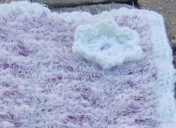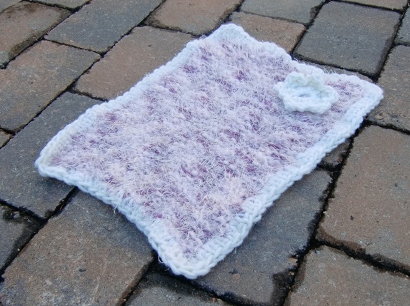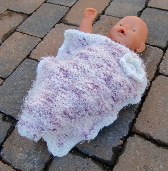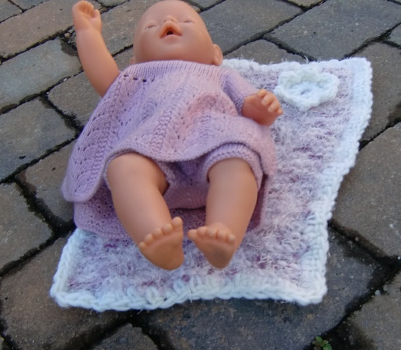 Vognteppe i lilla og rosa med hvite kant og blomst til dukken.