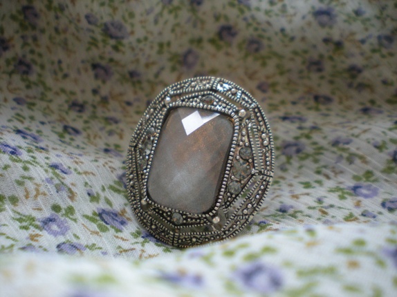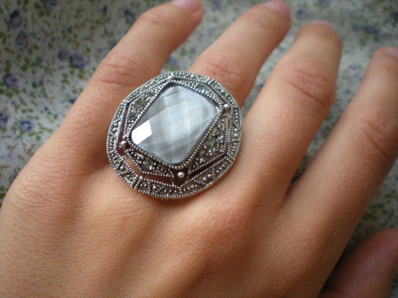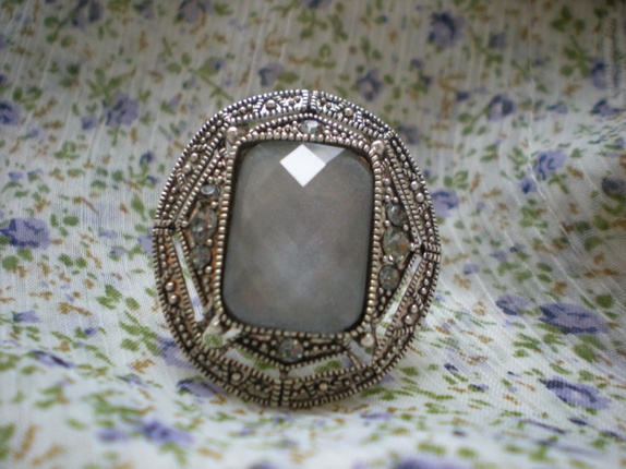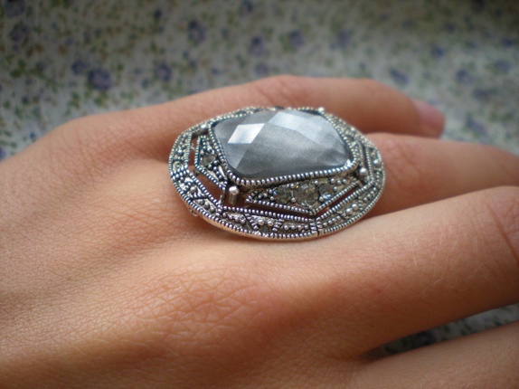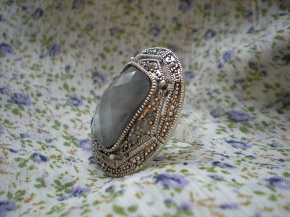 Oval ring i sølvfarget metall og grå fassetert sten-imitasjon av plast.I mønsteret er det små glitrende strass-stener.