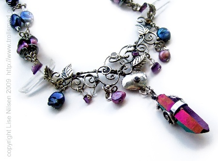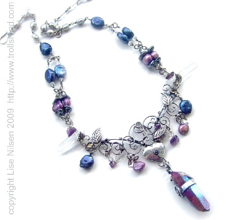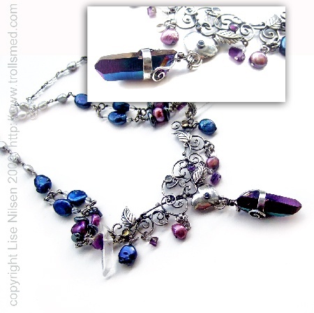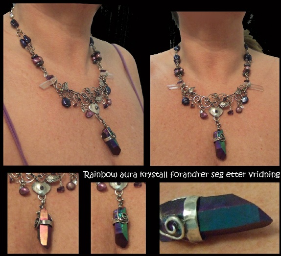 Sølv, bergkrystaller, ferskvannsperler, amethyst, citrin og en stor regnbue-aurakrystall. Det er en bergkrystall behandlet med titan for å få de fantastiske fargene.