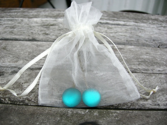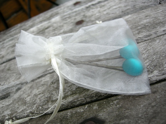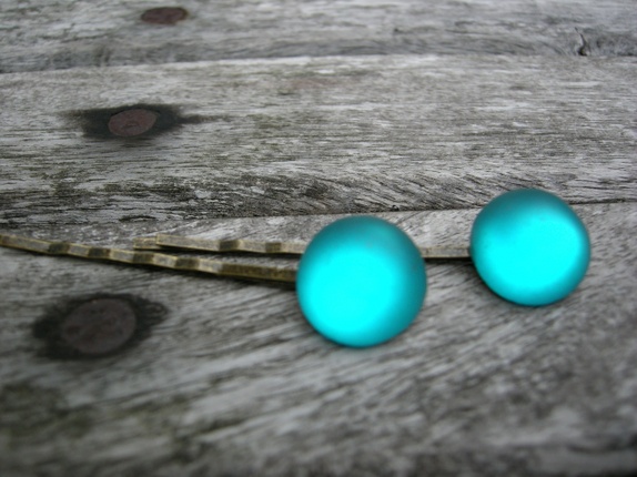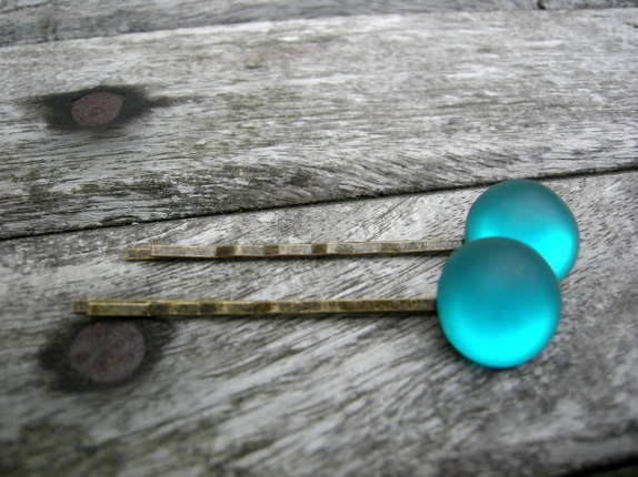 2 nydelige hårspenner med matte cabochoner av blått glass. Baksiden av glass bladet er smurt med "sølv" så bladet får en skinnende glød på samme måte som gjenstander laget med fattigmanns sølv.