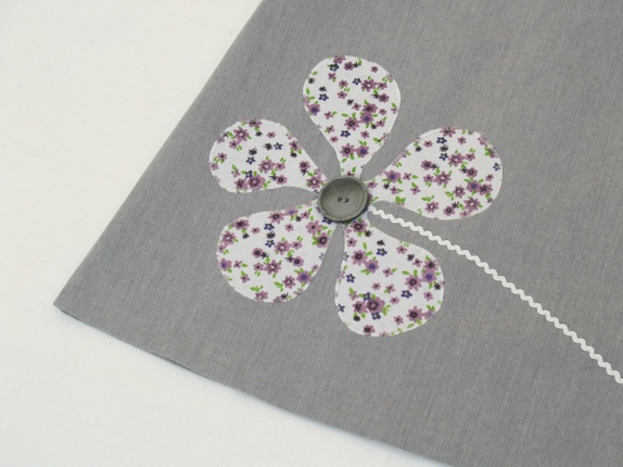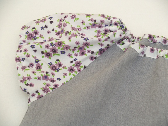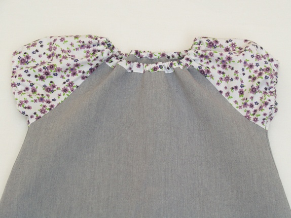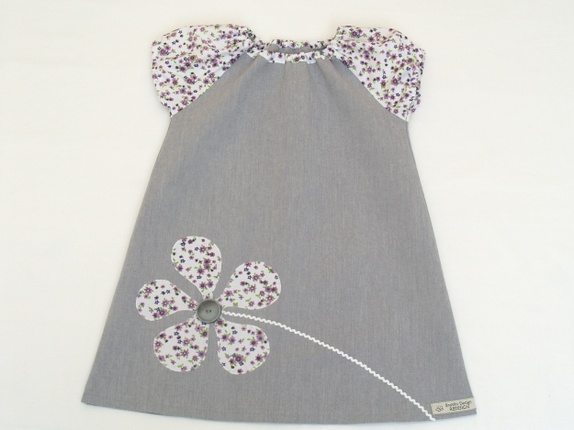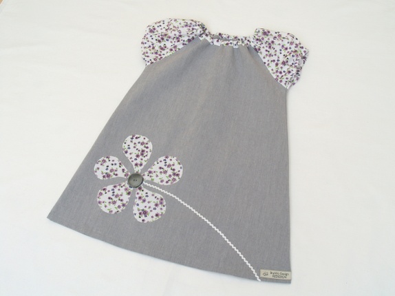 Selve kjolen er sydd av en grå gardin i kraftig, tett bomullsstoff - litt stivere enn hva som er vanlig i denne typen kjoler. Stoffet i ermene er fra en herre(!)skjorte med nydelige, små lilla blomster på hvit bunn. Kjolen er pyntet med en stor, applikert blomst i samme stoff som ermene, med en stor, grå knapp i midten.