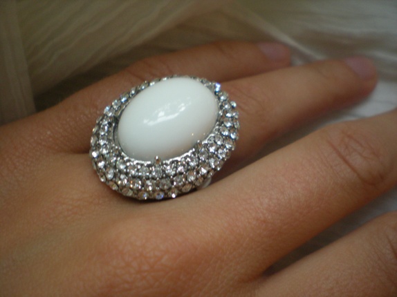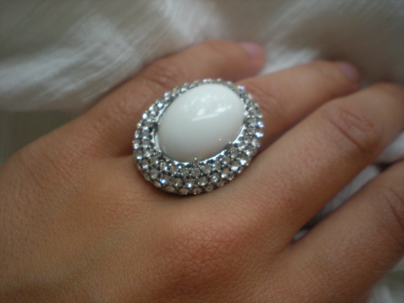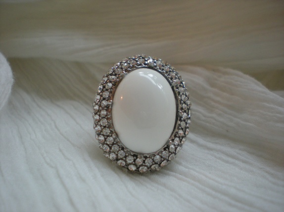 Oval ring i sølvfarget metall med hvit halvkule i plast og diamant-strass.