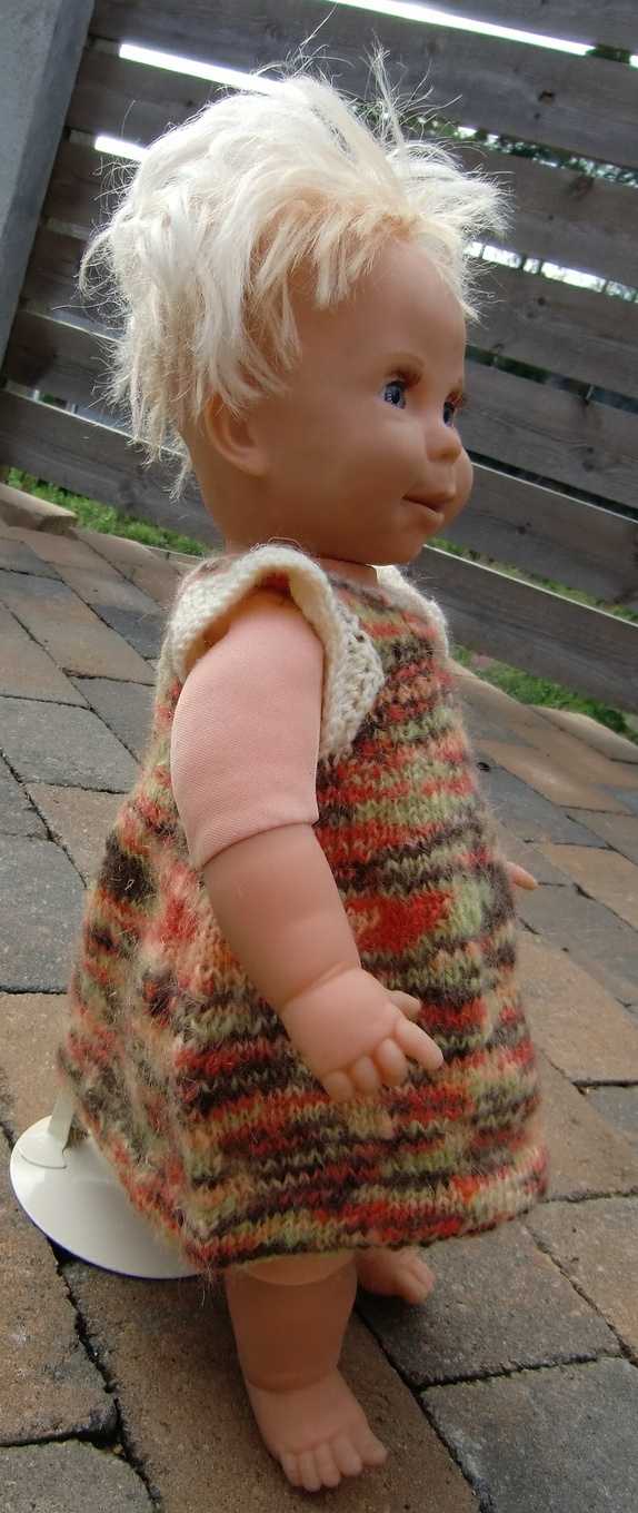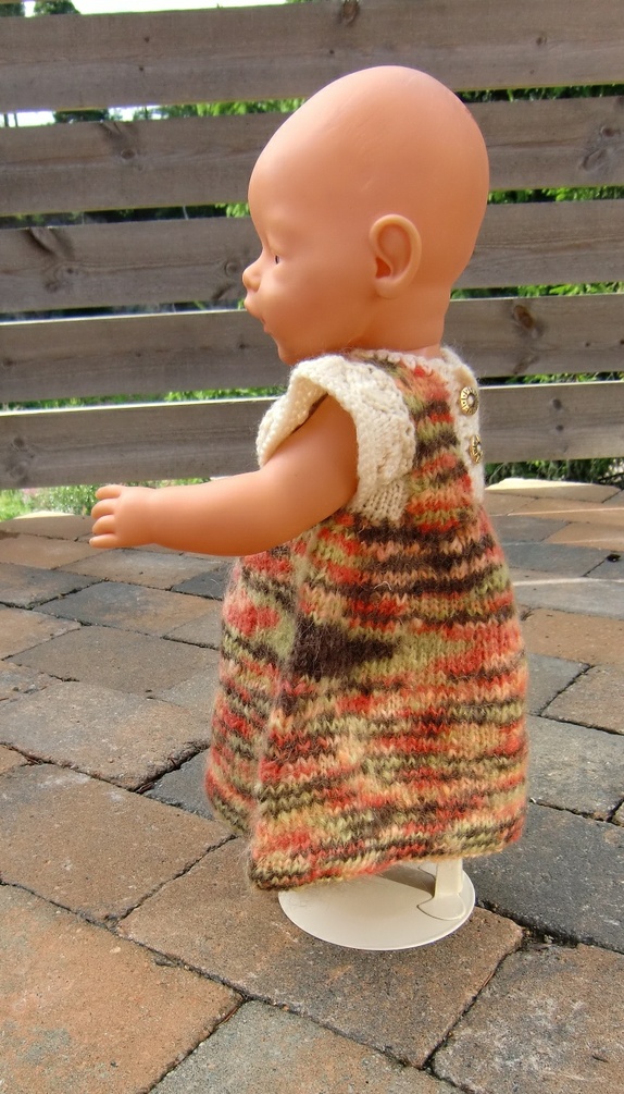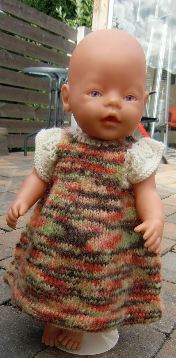 Kjole i flere farger med hvite ermer til dukken. Passer til dukker på størrelse med Baby Born men også Mirakel Baby.Kjolen kneppes med knapper i ryggen.