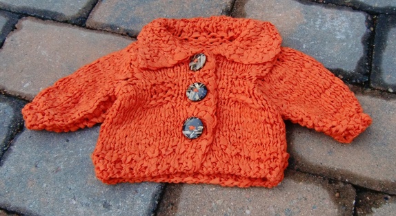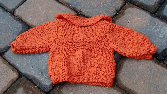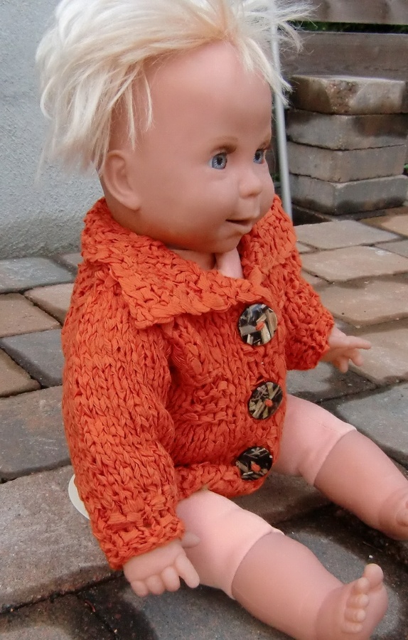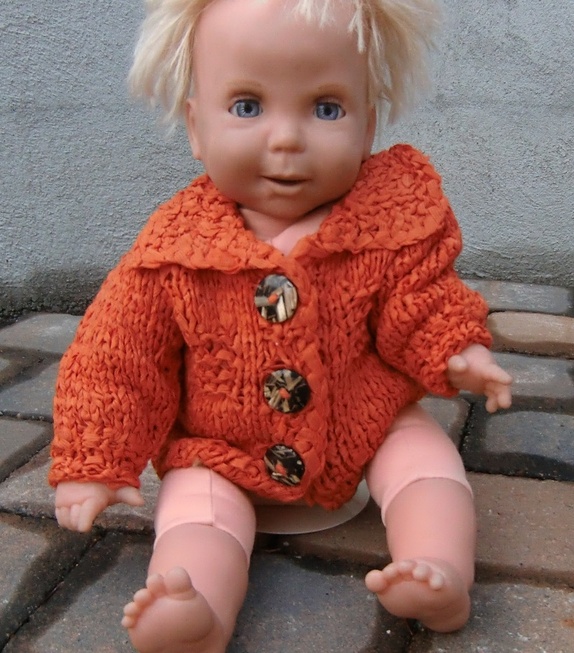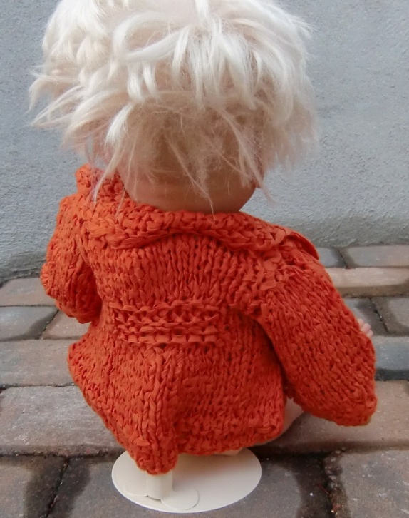 Jakke i oransje til dukken. Kneppes med knapper i front. Passer dukker på størrelse med Mirakel Baby.