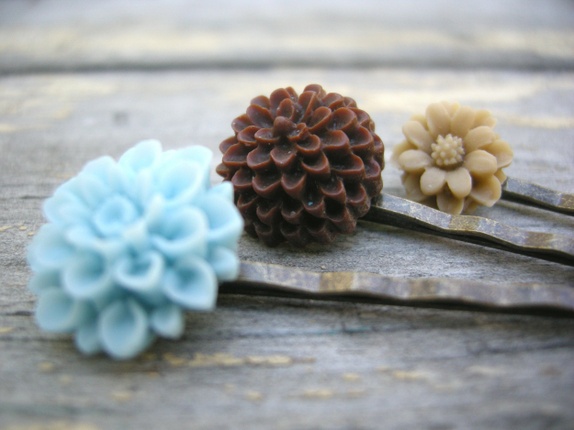 3 nydelige hårspenner i lys blå,beige og brun.Hårnål i oksydert kobber med akrylblomster.Limet er profesjonelt smykke lim og etterpå lagt i herder. Hver spenne måler ca 5,5 cm.