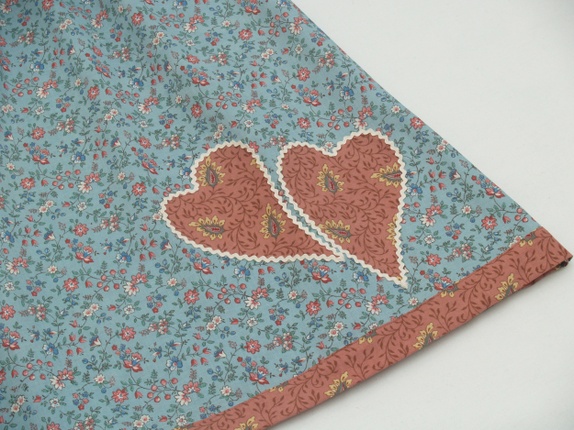 Søt kjole i lyseblått og gammelrosa. Sydd av to gjenbrukte gardiner. Pyntet med to applikerte hjerter som er kantet med smale kroklisser. Ren bomull. Strikk i hals og armer.