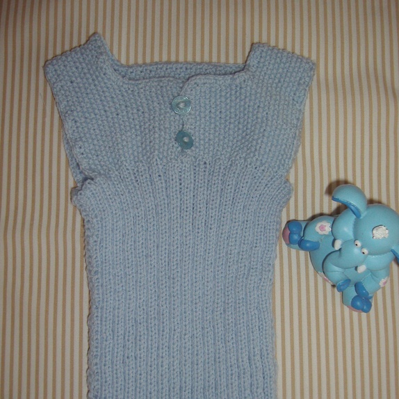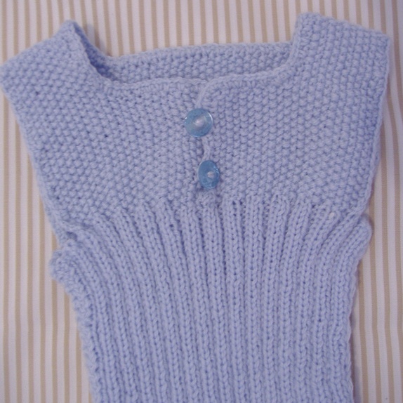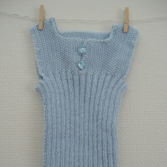 Nydelig isblå farge, lukning foran med to lys blå knapper. Heklet fastmasker rundt hals/erme. Strikket i Dale babygarn, 100% merinoull. Tøyelig, ca.str. 0-12 mndr.
