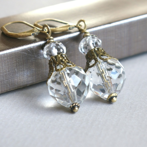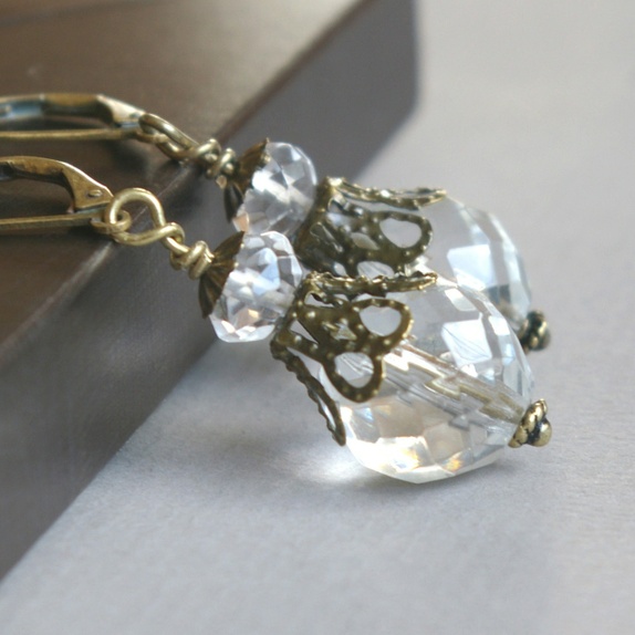 Øredobber som består av runde, fasetterte tjekkiske glassperler, mindre perler av klar kvarts(bergkrystall), og filigran perlehetter. Alt metall er messing. Nikkelfri.