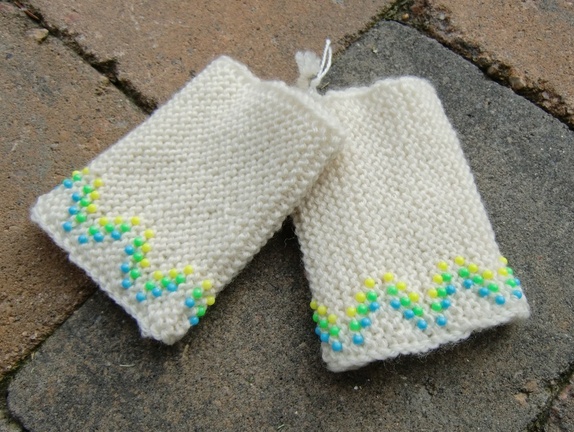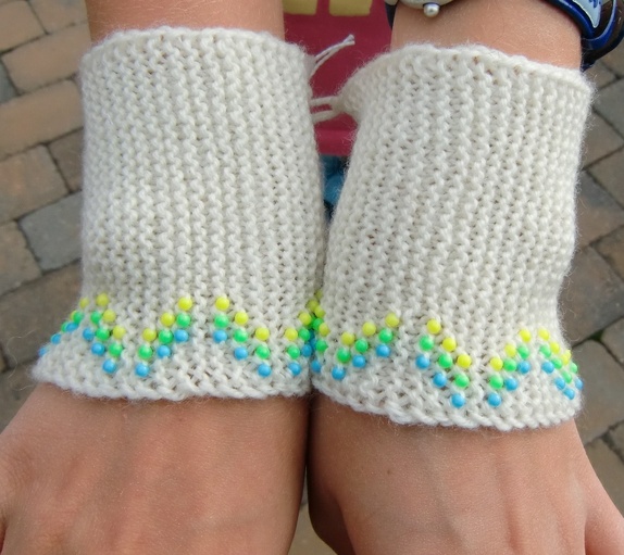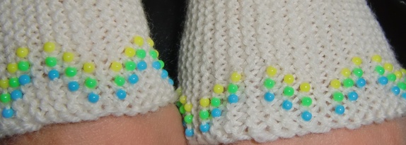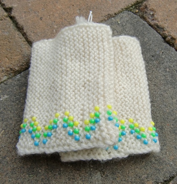 Offwhite pulsvarmere i ull med perler i gult, grønt og blått.Deilige og varme!