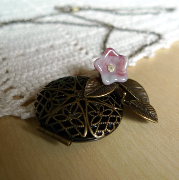 Medaljongen måler drøyt 3 cm på tvers, og er laget i messing som er behandlet for en antikk finish. Blomsten er i tsjekkisk glass. Kjedet er i messing, og er ca 52 cm langt. Kan gjøres kortere eller lengre etter ønske - bare gi beskjed når du legger inn kjøpet! :)