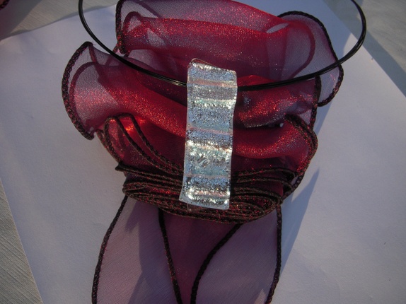 Håndlaget anheng i glass, sølvfarget. 5,5 cm langt og 1,8 cm bredt. Unikt. Har kjede til :