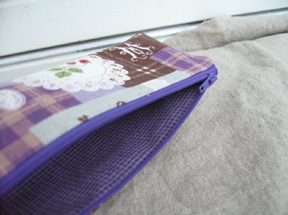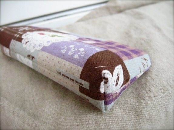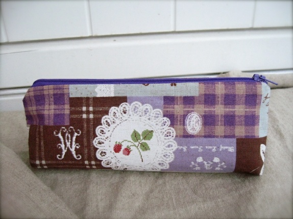 Sydd i japansk bomull/lin med lappeteppe mønster. Foret med smårutet bomull i lilla og med strykeinnlegg på begge lag.